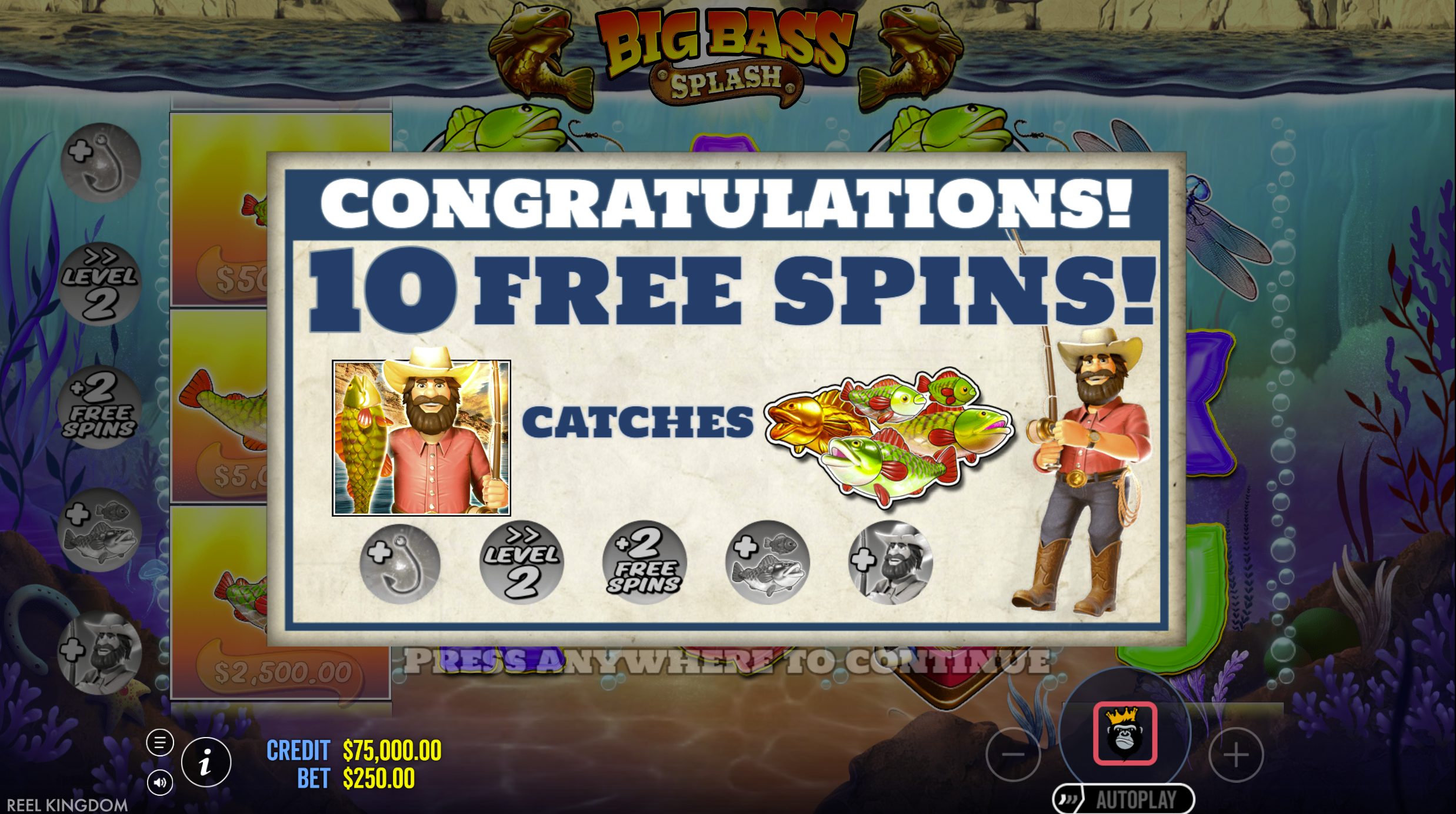 The familiar 5?3 layout and treasure chest scatter triggers remain, with the fisherman wild continuing his collecting duties. The significant evolution in Splash is the introduction of a cumulative multiplier that enhances every collection throughout the bonus session.