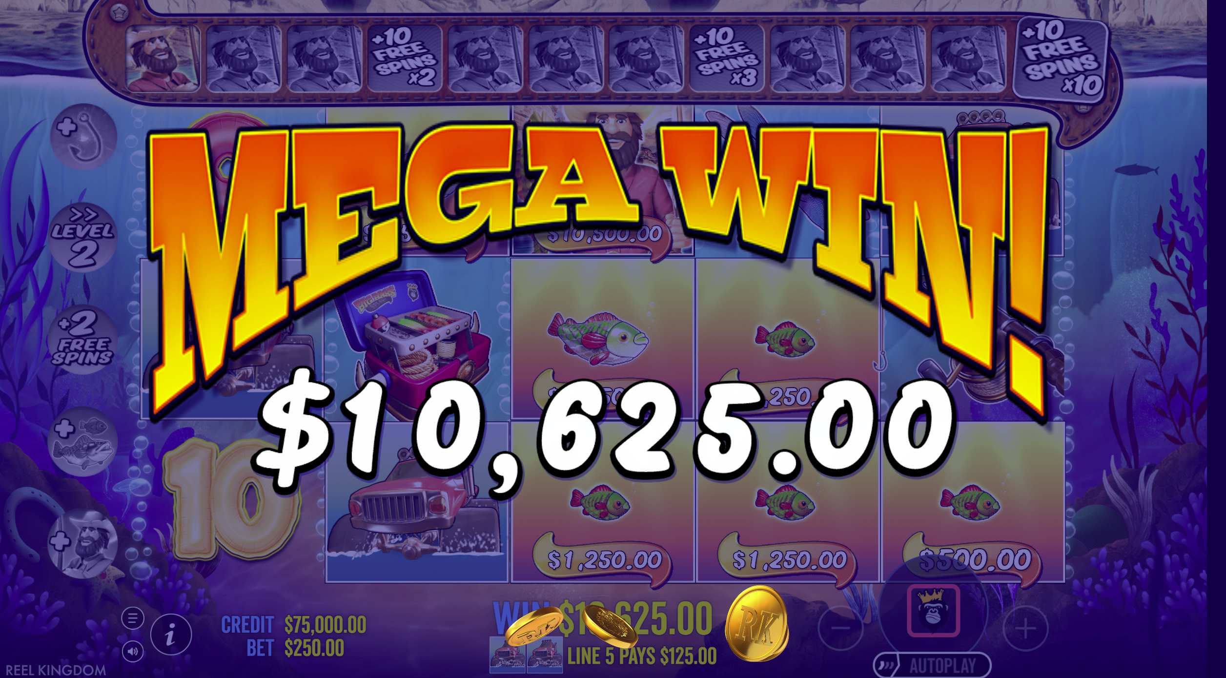 Begin your holiday bonus with 10 free spins. When money fish appear and the fisherman wild collects them, two things happen: you receive +1 extra spin, and the global win multiplier increases by +1. This multiplier applies to all subsequent collections in the round and continues climbing (up to 10x) without resetting, meaning later catches can be worth exponentially more than early ones.