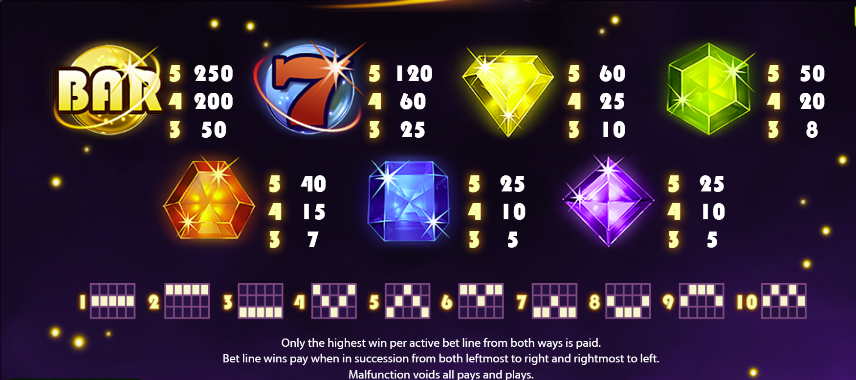 • Colour gem symbols basic to medium-value payouts for aligned lines.